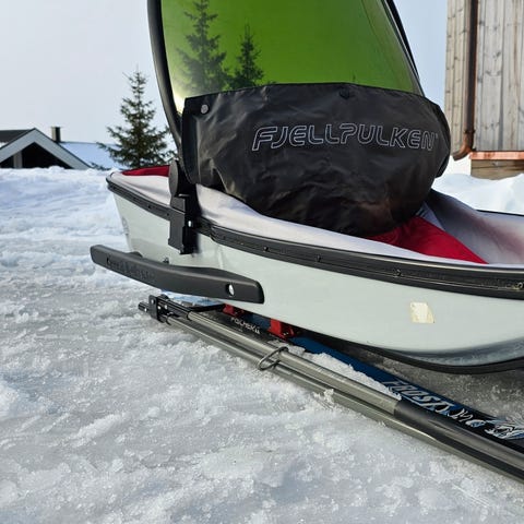 Fjellpulken fra 2020. Pulk i rød farge med vindskjerm i front. Pulk med stivt drag og trekksele for person som drar pulken. Egnet til transport av barn eller utstyr på ski- og vinterturer. Leveres med drag og hoftebelte/sele som vist på bildene.