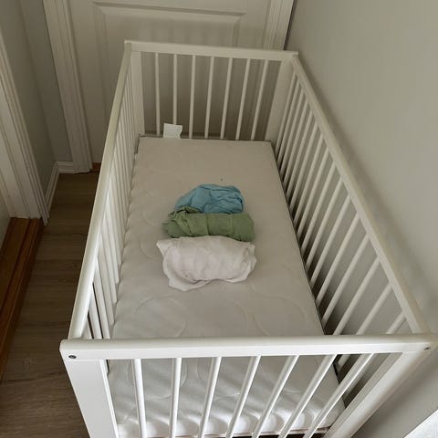 Sprinkelseng, utvendig mål: 124x66 med to madrasser. Dyne strl. 118x94 medfølger hvis ønskelig. Dyne- og putetrekk følger med.
