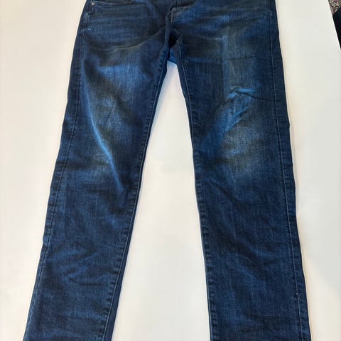 G-Star jeans for herre i blå denim. Klassisk 5-lommers modell med knapp- og glidelåslukking. Fremstår i mørk blå vask med noe lysere partier på lår og knær.