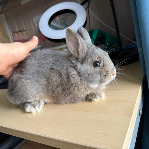 2 Hermelin kaniner, en svart og en grå. Begge er jenter. De er ca. 1 år gamle. Rolige og fine. Kan fint løftes og koses med, men de foretrekker helst vandre fritt og utforske.