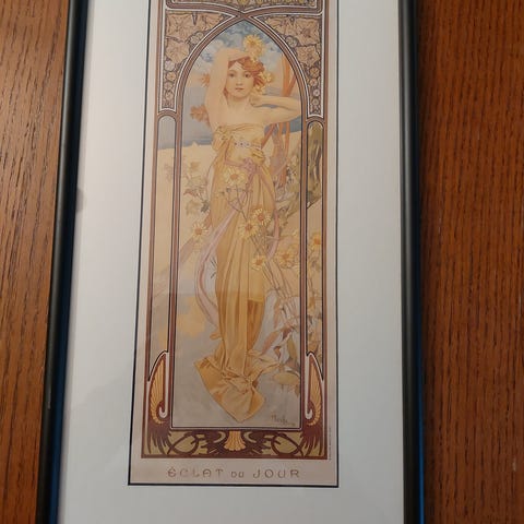 Innrammet kunstplakat i art nouveau-stil. Motivet viser en stående kvinne i lang kjole omgitt av blomster og trær, i varme, dempede fargetoner. Bildet er montert i en smal, mørk ramme med passepartout og oppheng på baksiden. Egner seg som veggdekor i stue, gang eller soverom.