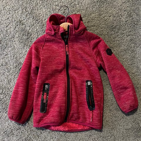 Name it jakke for barn i størrelse 110. Jakken er rosa og laget i polyester, med myk, pelsliknende overflate. Modellen har hette og glidelåslukking foran. Passer til jente og egner seg som jakke til penbruk.