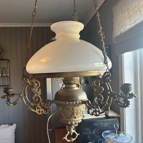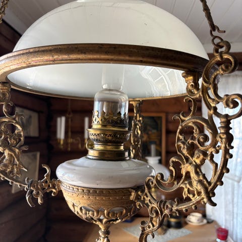 Hengelampe i ukjent merke med dekorativt oppheng i messingfarget metall og rødlakkert keramisk midtparti med relieffdekor. Lampen har utskårne metallornamenter med blomstermotiv og fugler, samt kjeder og takfeste i samme stil. Øverst er det en hvit, mønstret glasskjerm som sprer lyset jevnt.