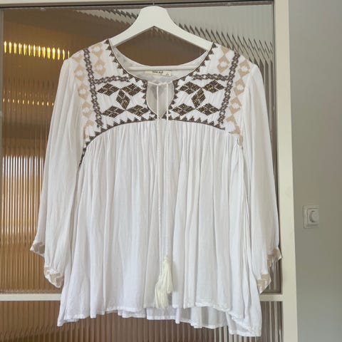 Nydelig bluse fra Hale Bob i en vakker off-white nyanse med dekorative broderier i varme gulltoner. Den har en feminin, lett bohemsk stil med flotte detaljer ved brystet, skuldrene og mansjettene – typisk for merkets karakteristiske, luksuriøse uttrykk.