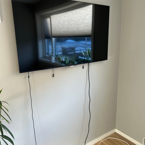 Flat TV med veggmontering, som vist på bildene. Modellen har slank ramme og passer til stue eller soverom. Selges med veggfeste, men ikke tv-beina.