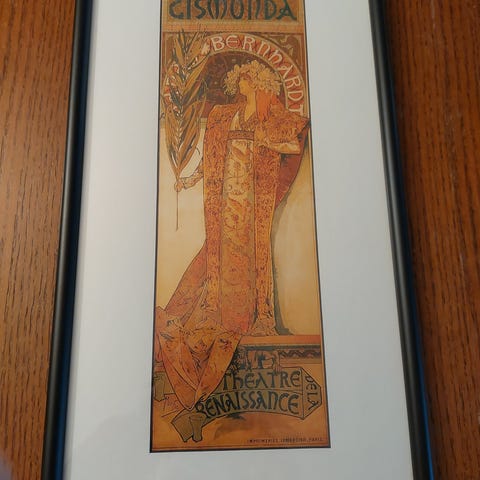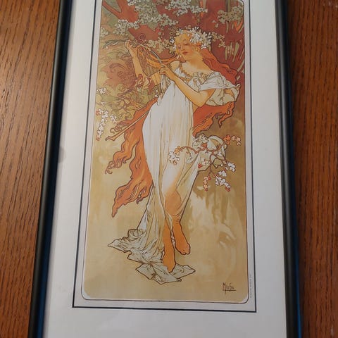 Innrammet kunstplakat med motiv av stående kvinnefigur i dekorativ, stilisert ramme. Bildet har lyse, varme fargetoner med blomster- og naturmotiv rundt figuren. Plakaten er montert i rektangulær ramme med passepartout og oppheng på baksiden. Egnet som veggdekor i stue, gang eller soverom. 45 x 25 cm