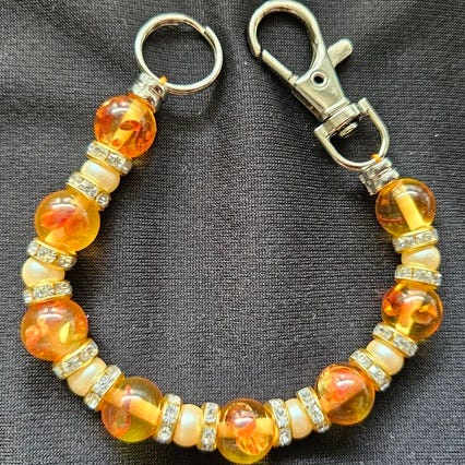 Armbånd laget med krystallperler av ekte Rav. Omkrets ca. 18 cm. Fleksibelt strikk for å passe ulike håndleddstørrelser.