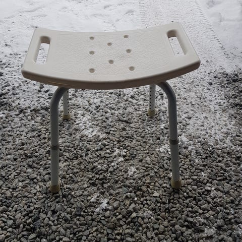 Dusjkrakk i hvit plast med metallben. Setet har avrundet rektangulær form med håndtak i hver ende og dreneringshull i midten for å lede bort vann. Benene har sklisikre føtter for økt stabilitet på vått underlag. Egnet som sittehjelp i dusj eller bad for personer som trenger ekstra støtte og trygghet ved personlig hygiene.