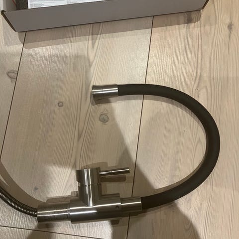 IKEA kjøkkenbatteri i svart utførelse. Blandebatteriet har to fleksible tilkoblingsslanger i metall for varmt og kaldt vann, samt uttrekkbar tut med slange for spyling. Passer til montering i kjøkkenbenk eller vask med standard hull for kjøkkenarmatur. Egnet som erstatning for eksisterende kjøkkenkran der tilkoblinger og dimensjoner er kompatible med dette batteriet. Kranen drypper litt.