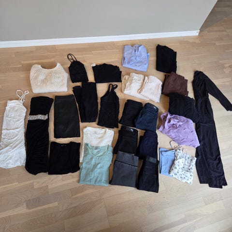 Klespakke str S. Noe er mer brukt enn annet. Men vil si at det meste er i god & fin stand. Masse bruk igjen. (Noen få ting er i str m, men passer en s)