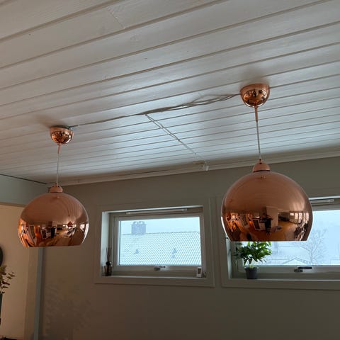 Selger også to IKEA Skaftet pendellamper en forkrommet, og en i messing. 100kr. pr stykk. Følger med oppheng, men ikke lyspære.