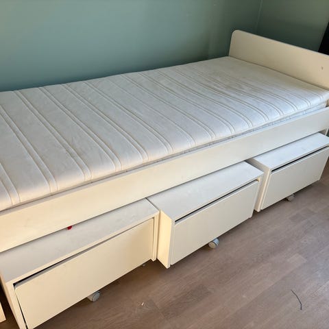 Veldig fin og praktisk enkeltseng med 2 oppbevaringsskuffer under. Skuffene er delt opp i 4 rom, men oppdelingen kan også fjernes.