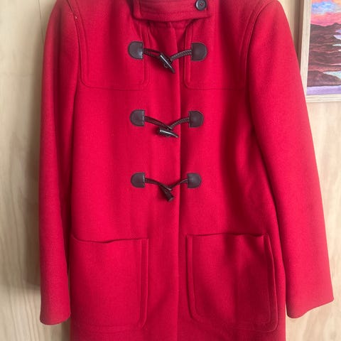 Burberry Duffelcoat i nydelig rød farge selges. Den har hette, hornknapper/løkker foran og på mansjettene, samt store frontlommer og med det ikoniske Burberry tartan rutemønsteret på innsiden og i hetten.