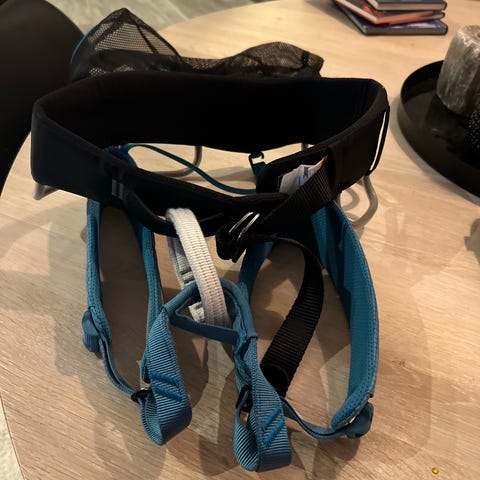Klatreselen er ca. 10 år gammel. Den er brukt 10-15 ganger og hovedsakelig inne. Ikke brukt siste 4 år. Selen er lagret tørt og mørkt.