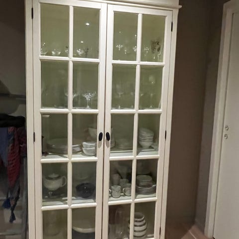 Vitrineskap gis bort, hentes så fort som mulig. Låsen er desverre ødelagt, men laget en ny lås med krok,se bilde . H 220 b ca 114. Er veldig tungt,så trengs flere når det hentes for å bære