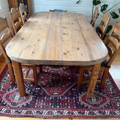 Selger et solid spisebord laget av ekte tre med tilhørende 10 stoler. Møbelet er pent brukt og i god stand. Bordet er stabilt og romslig, og passer godt for store familier eller sosiale sammenkomster. Klassisk design som passer i de fleste hjem. Må hentes. Pris kan diskuteres ved rask handel. Ta kontakt for mer informasjon eller visning.