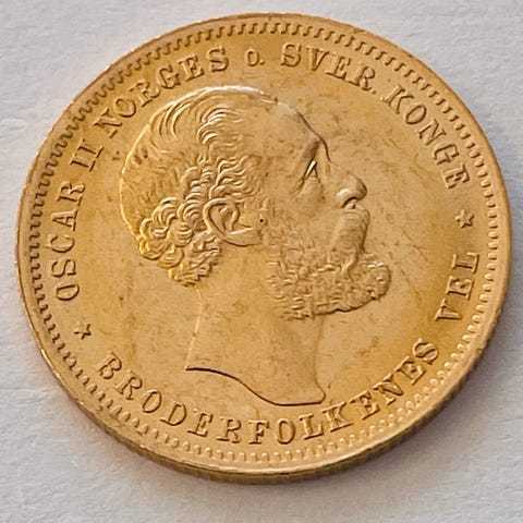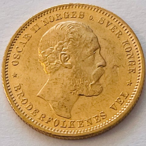 Norge 20 kroner gullmynt fra 1875 med portrett av kong Oscar II på advers og riksvåpen med løve og krone på revers. Påskrift rundt portrettet og verdien «20 kroner» med årstall 1875 på baksiden. Mynten er preget i gull og har pålydende verdi 20 kroner. Egner seg som samlerobjekt innen norske historiske mynter og numismatikk.