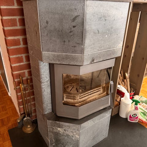 Vedovn med klebersteinsider og integrert stekeovn. Ovnen har øvre hylle/nisje i stein som kan brukes til matlaging eller varmeholding, samt fyringskammer med doble glassdører og metallhåndtak. Under fyringskammeret er det askeskuff med egen dør og håndtak. Ytterkonstruksjonen er i mørklakkert metall kombinert med kleberstein på sidene for varmelagring. Passer til oppvarming og enkel matlaging eller baking i bolig, hytte eller lignende. Finnes små bruksmerker på peisen. Det er en liten sprekk på en av brennplater. Solid og tungt peis. Det er cirka 90 kg kleberstein på vedovn.