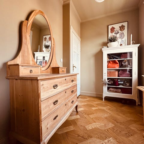 60-talls møbler (2 nattbord, 1 kommode og et sjarmerende skap med speil til soverommet)- romantisk stil