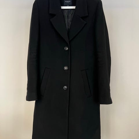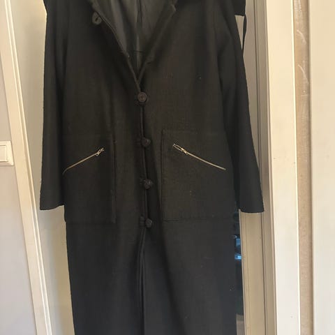 Masai ullkåpe i størrelse S. Kåpen er svart og laget i 80% ull og 20% viskose. Den har belte i livet, lange ermer med ribbestrikkede mansjetter og trykknapper uten synlig lukking. Lommer i sidene.