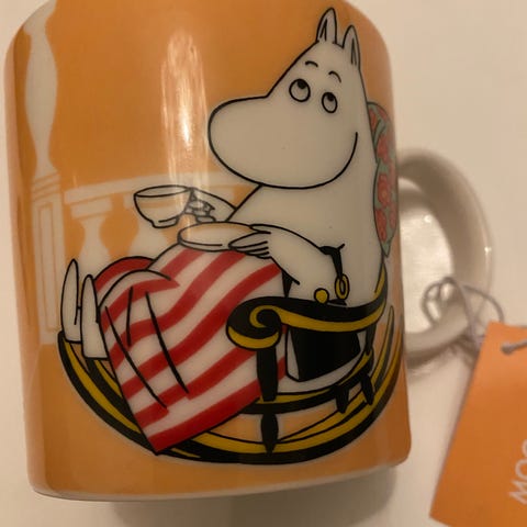 Arabia Mummi kopp i grønn farge med Mummi-motiv. Koppen har hank og er egnet til varme og kalde drikker. Passer til daglig bruk på kjøkkenet eller som del av en Mummi-servisesamling.