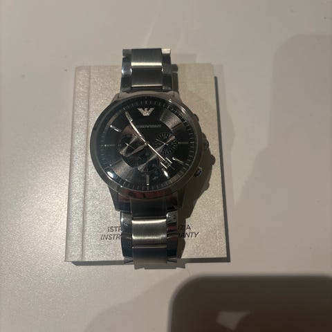 Armani herreklokke i svart design med kronografvisning. Klokken har rund urskive med tre mindre delskiver for tidtaking og datovisning. Metalllenke og kasse i matchende svart utførelse. Analog visning med markerte indeksstreker og tre visere. Egnet som herreklokke til både hverdagsbruk og mer formelle anledninger.