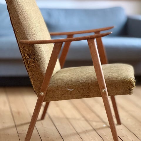 Veldig kul retro lenestol som har blitt trukket om. Den er godt brukt og har løsnet litt enkelte steder, som sikkert kan fikses enkelt av en hendig person. Røff look på treverket som kan utbedres med litt kjærlighet. Pris kan diskuteres