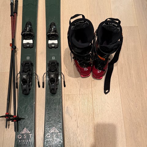 Alpinski 126 cm med støvler og bindinger. Farger i rød, hvit og svart svart.