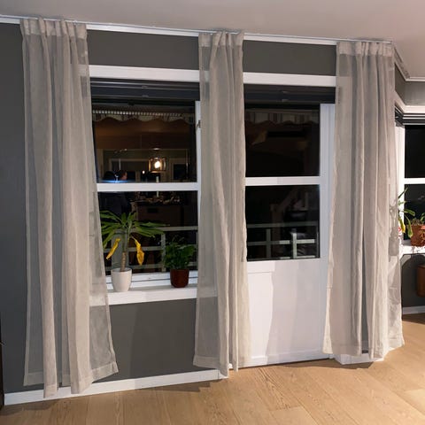 Pen liftgardin selges. Den er 232 cm bred og 160 cm høy og festes enkelt i taket ved hjelp av medfølgende klips (festeanordningen er ikke laget for veggoppheng). Heises opp og ned med kjedetrekk. Pent grått stoff foret med hvitt stoff bak. Pga. størrelsen/lengden kan den bare sendes med Posten (ikke ‘Fiks ferdig’), og da koster selve forsendelsen kr. 400 i tillegg til salgssummen.