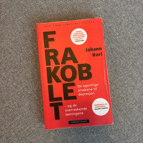Johann Hari Frakoblet bok på norsk. Sakprosabok om depresjon, årsaker og mulige løsninger. Innbundet utgave med rød forside og svart tekst. Egner seg for lesere som er interessert i psykologi, mental helse og samfunnstematikk.
