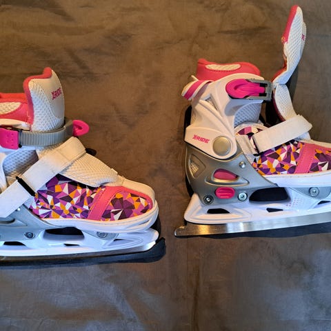 Xtreme skøyter fra Biltema i blå, hvit og svart farge. Justerbare skøyter i str. 33-37 med plastskall og polstret innersko. Lukkes med spenner og borrelås for god tilpasning rundt foten.