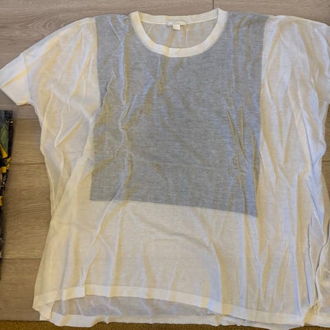 Selger en kremhvit T-skjorte fra COS i str S. Myk og god. 100% bomull. Det er en svak flekk foran, se bildet. Jeg har ikke forsøkt å fjerne flekken, så det er mulig den går bort med flekkfjerning:-) Jeg opplever uansett ikke flekken som sjenerende.