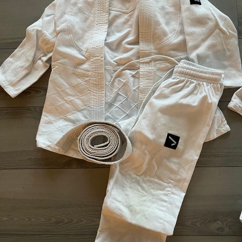 Performance karate/kampsportdrakt for barn i størrelse 140. Drakten består av jakke og bukse i hvit farge, tilpasset kampsporttrening. Hvitt belte følger med.