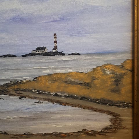 O. Oltesvik maleri med landskapsmotiv. Bildet viser et fargerikt landskap med innsjø, trær, vegetasjon og to ender i forgrunnen. Maleriet er rektangulært og horisontalt orientert, og er innrammet i en lys treramme med mørkere kant ytterst. Ca 60x130cm