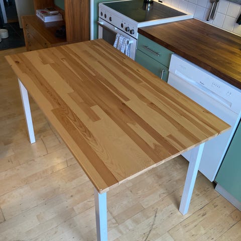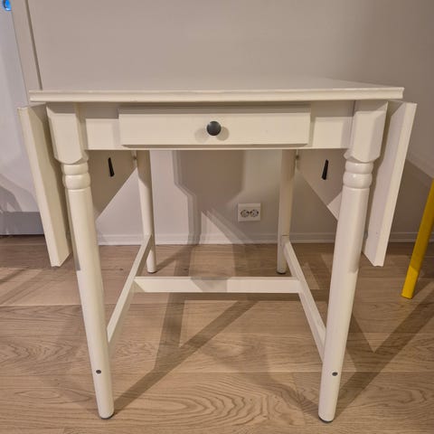 Pent brukt kjøkken / spisebord med lite skader. 122cm uten klaff og cirka 150cm med klaff oppe. Passer til 4-6 stoler.