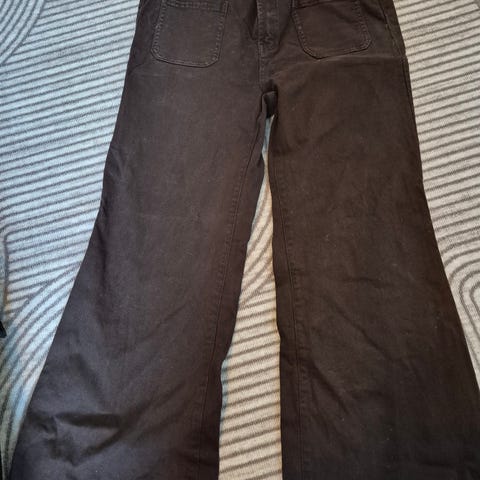 Fishbone bukse for dame i størrelse M. Buksen er grå. Tøft stoff med en slags innvevde striper. Den har klassisk buksefasong med linning og beltehemper, samt lommer foran og bak.