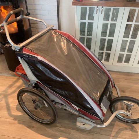 Thule Chariot Cheetah 2 sykkelvogn til barn. Vognen har to store hjul bak og valgfrie mindre støttehjul foran, samt drag for montering på sykkel. Den leveres med sikkerhetsflagg for bedre synlighet i trafikken. Egnet for transport av ét eller to barn bak sykkel på vei og sykkelsti, og kan også brukes som barnevognvogn på korte turer til fots der underlaget tillater det.