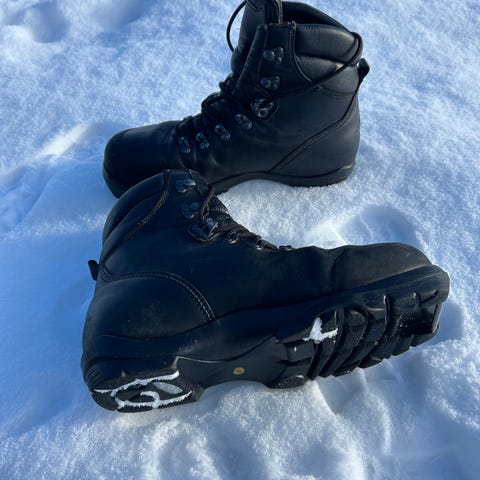 Alfa fjellstøvler i størrelse 40. Støvlene er i svart skinn og goretex med høyt skaft og snøring med hemper. Skoene er brukt en halv sesong og har mindre bruksmerker. De er solide og er godt tatt vare på. Størrelsen passer godt til meg som bruker 39-40 i sko til vanlig. Selges fordi jeg har byttet ski.