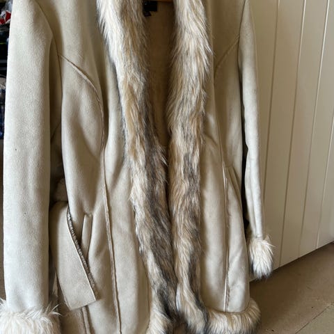 Kåpei fuskepels for dame i størrelse L. Kåpen er brun med leopardmønster og har myk, pelset overflate. Den har krage, knepping foran og er helfôret på innsiden.
