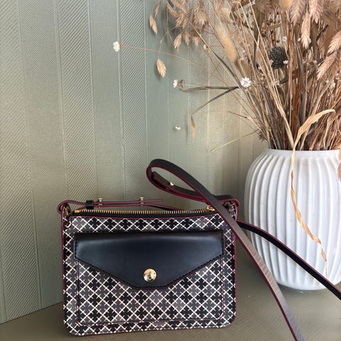 By Malene Birger skulderveske for dame i kunstlær. Vesken har rektangulær fasong med klaff og karakteristisk mønster i svart og brun. Den har topphåndtak og avtakbar/justerbar skulderrem med metallfester. På baksiden er det en utvendig lomme. Innvendig har vesken flere rom og kortlommer, samt glidelåslomme for mindre eiendeler. Egnet som hverdagsveske eller til enklere bruk der det er behov for å ha med det viktigste.