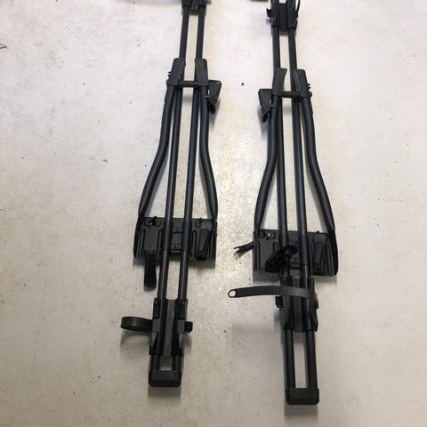 Bredde ca. 113 cm totalt. Passer til biler med rails. Låser fungerer. 2 nøkler til hver. Kompatible med sykkelstativ som jeg har ute i egen annonse.