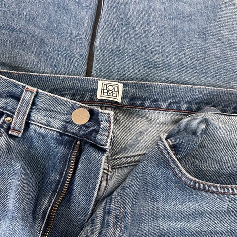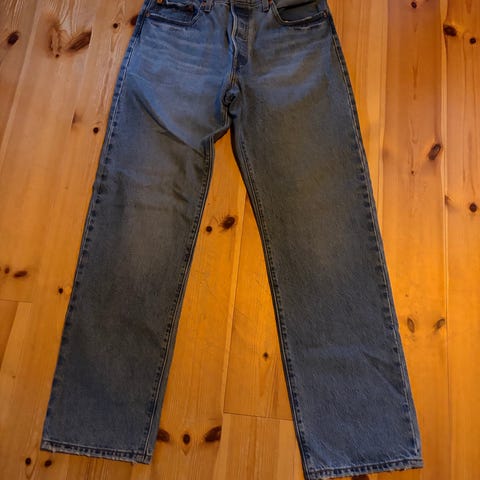 Veldig pent brukt, vasket et par ganger. Buksen er laget i bomull og har klassisk femlommers design. Den kommer i en blå denimfarge med knappelukking foran og baklommer.