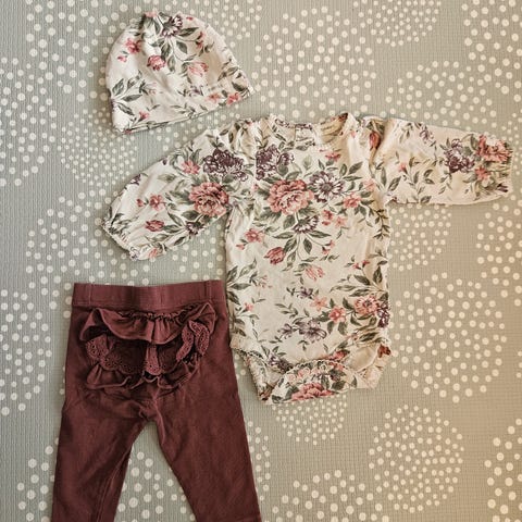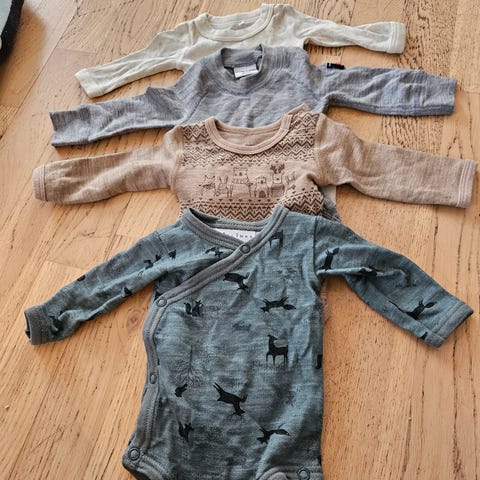 Klespakke med pent brukte klær i ull i str. 50. Pakken består av 3 omslagsbodyer fra Joha og 2 bukser fra Joha.