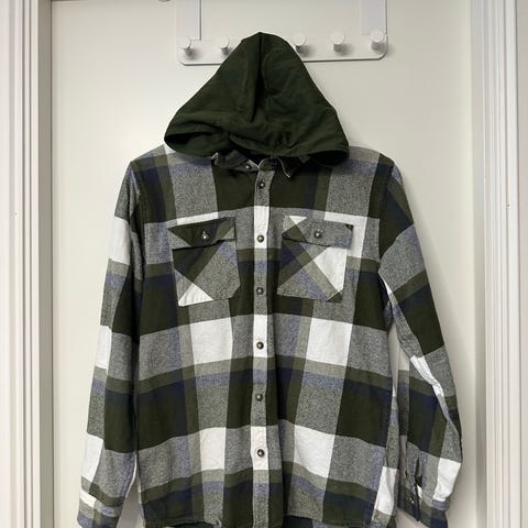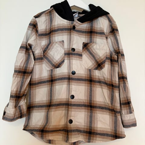 Name it skjorte med hette for barn i størrelse 128, unisex. Skjorten er laget i bomull og har et rutete flerfarget mønster med lys bunnfarge og kontrastfargede ruter. Den har lange ermer, knappelukking foran og brystlomme på ene siden. Hetten er i ensfarget mørk tekstil som kontrast til skjorten. Passer til hverdagsbruk og kan brukes alene eller som et ekstra lag over t-skjorte eller genser.