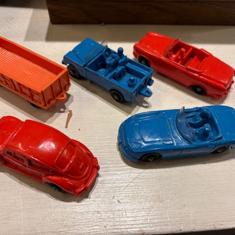 Samling 8 tomte lærdal vinyl leker / biler / reservedeler. En del skader eller dårlig kvalitet. Se bilder. Selges samlet.
