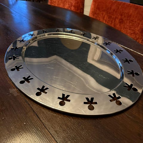 Vakkert og elegant serveringsbrett fra Alessi sin Michael Graves serien. Brettet er utført i blankpolert, rustfritt stl og er utstyrt med praktiske håndtak med et ergonomisk grep. Det vakre, italienske designet er en fryd for øyet og passer perfekt inn i det moderne - så vel som klassiske hjem.