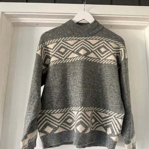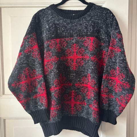 Ullgenser i mørk grå og rød farge med glidelås i halsen. Størrelse M, men vil si den passer S-M. Veldig fin genser, men har rett og slett for mange av samme type.