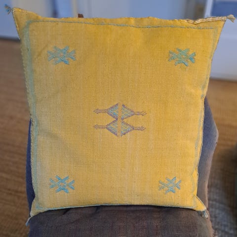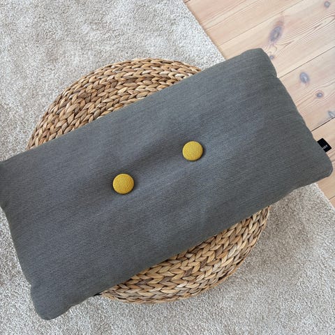Hay pyntepute i sennepsgul farge. Rektangulær pute med knappdetalj i midten. Tekstiltrekk med struktur.