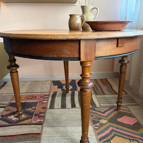 Ukjent merke spisestuestol i tre, brunfarget. Stolen har rundt sete i tre og buet rygg med utskårne detaljer. Klassisk design med fire ben og tverrstag for ekstra stabilitet. Egner seg til bruk ved spisebord eller som ekstra sitteplass i ulike rom.