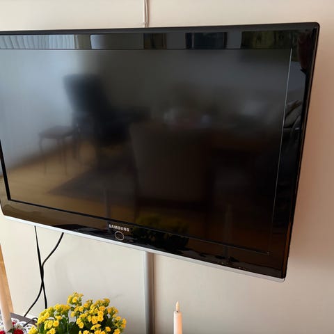 Samsung TV i hvit utførelse. TV-en har flere tilkoblingsmuligheter, blant annet HDMI, USB, komponent og antenneinnganger, slik det fremgår av bildene. Egner seg til vanlig TV-bruk eller som skjerm til tilkoblede enheter via HDMI eller andre tilgjengelige innganger. Størrelse og modellbetegnelse er ikke oppgitt og bør eventuelt kontrolleres på selve apparatet.